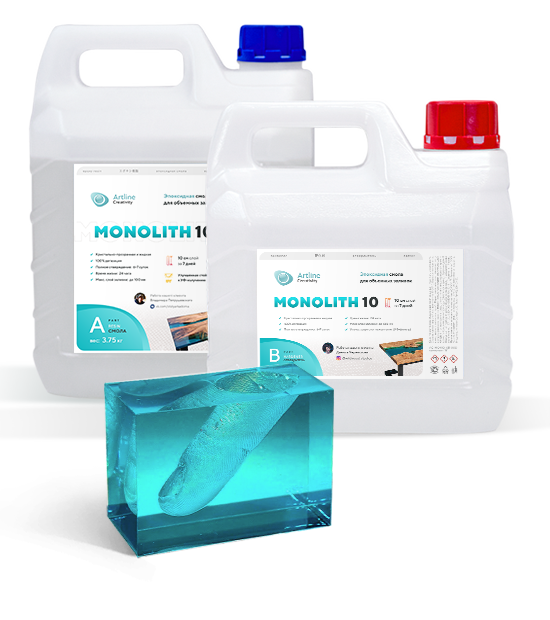 Artline MONOLITH — эпоксидная смола высшего качества, подходит для создания высоких слоев, позволяющих заливать 5 или 10 см за раз. Максимально защищена от УФ-излучения, в отличии от других смол, что позволяет изделиям оставаться кристально-прозрачными (без пожелтения) как можно дольше.