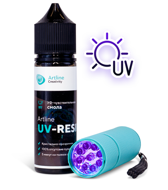 Artline UV-Resin представляет собой однокомпонентный состав в виде геля, который не требует добавления катализатора. Отверждающим агентом являются ультрафиолетовые лучи, в качестве источника используют: маломощные УФ-фонари, УФ-лампы, солнечный свет.